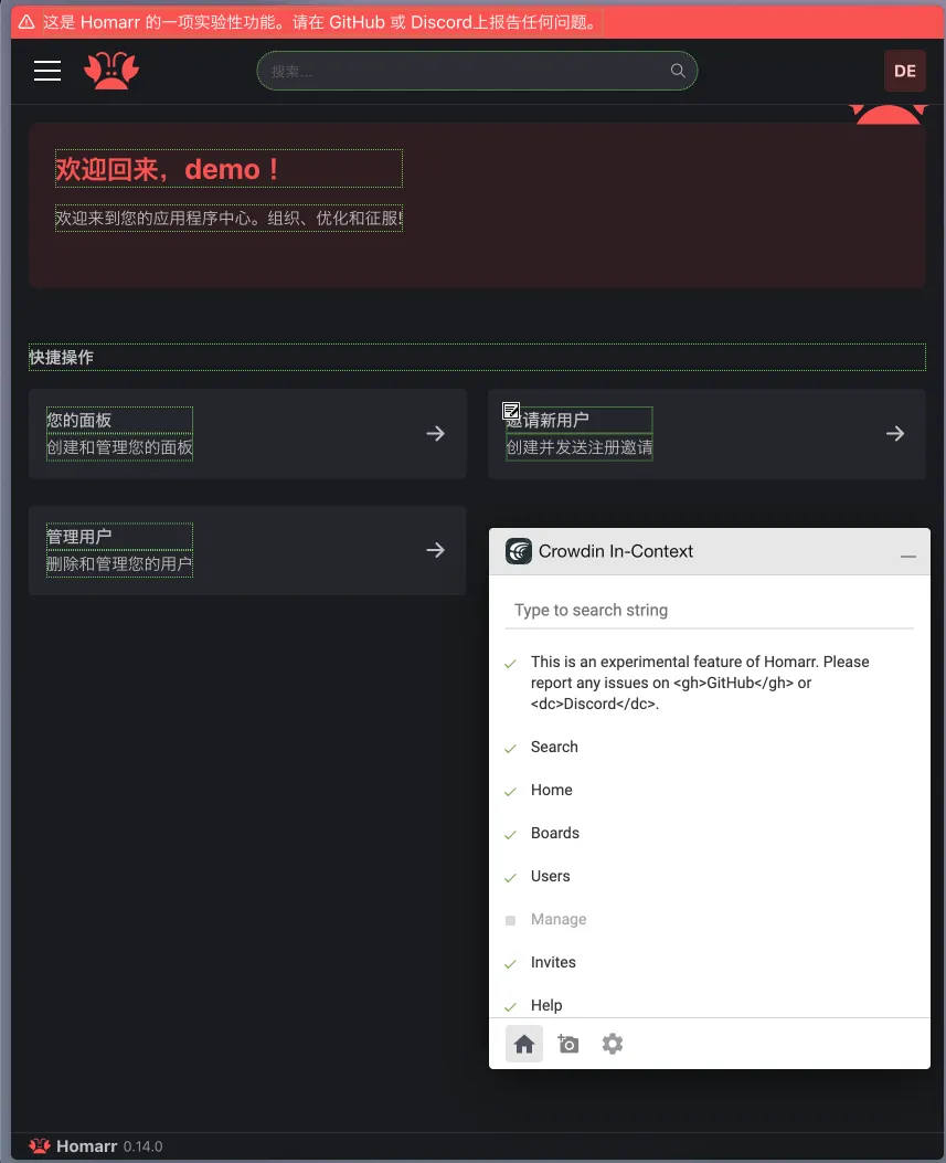 Since v0.14.0, you can now help translate homarr directly from the app ! To do so simply to go your user settings and select "Crowdin (live translations)" as the language. Then you'll be prompted to connect to your crwodin account and choose the language in which you want to transalte. You can then start translating directly from the app by selecting some text on the app. If some text cannot be selected to be edited with the live translation tool, you can sill translate it inside of the In-Context popup at the Home tab, it will be red if it's not translated yet.